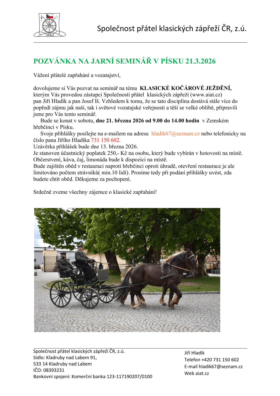 dovolujeme si Vás pozvat na seminář na téma KLASICKÉ KOČÁROVÉ JEŽDĚNÍ, kterým Vás provedou zástupci Společnosti přátel klasických zápřeží (www.aiat.cz)