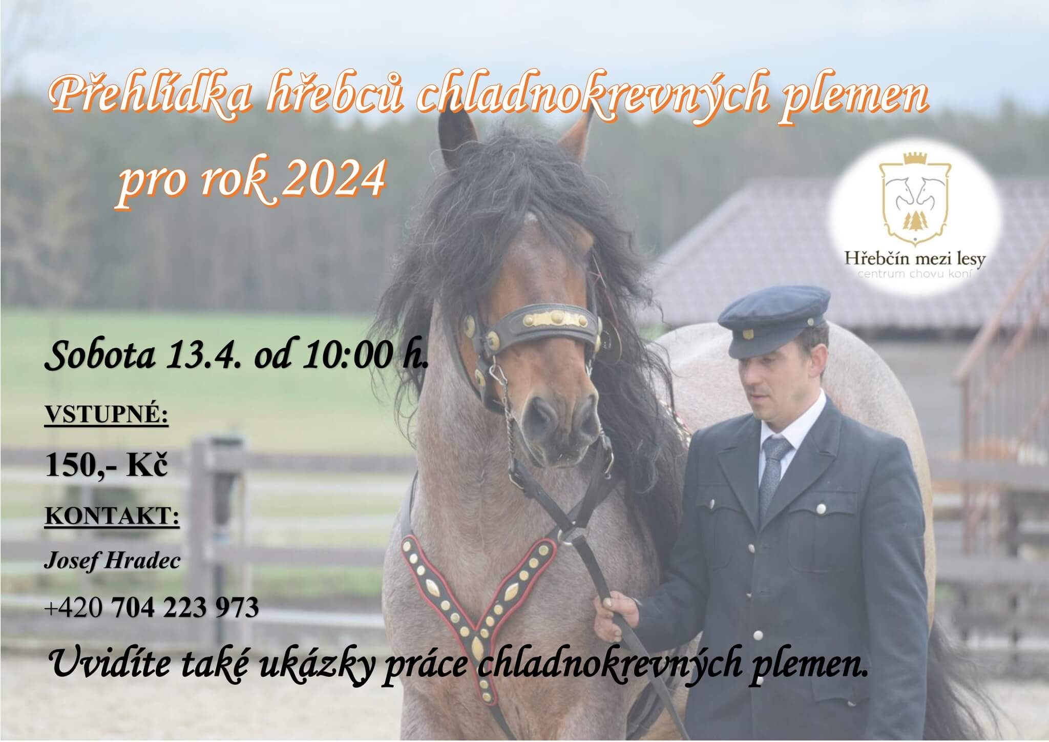 13.04.2024 se koná každoroční přehlídka plemenných hřebců chladnokrevných plemen v Hřebčíně mezi lesy v Dolním Jelení.